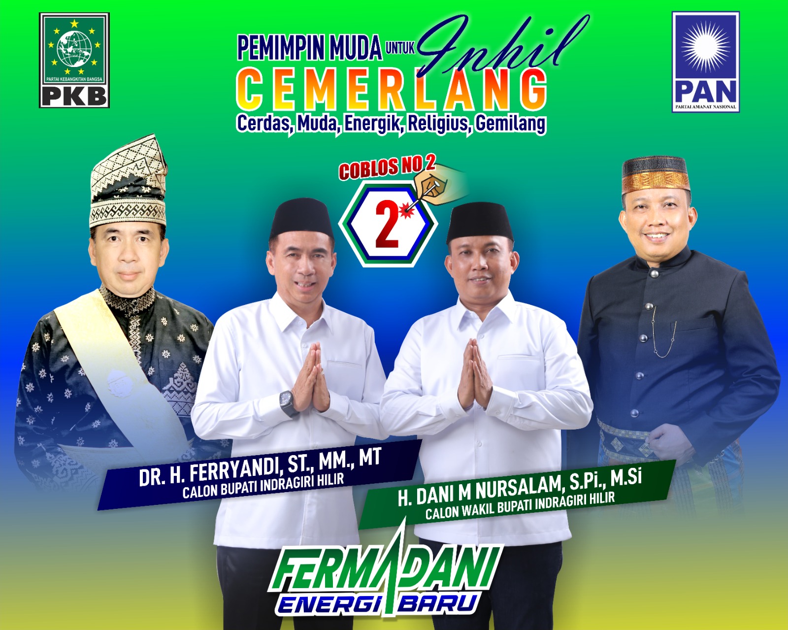 Pasangan yang akrab dengan sebutan Fermadani ini yakin nomor urut 2 bisa memberikan energi baru bagi tim pemenangan, pendukung dan masyarakat Kabupaten Inhil.