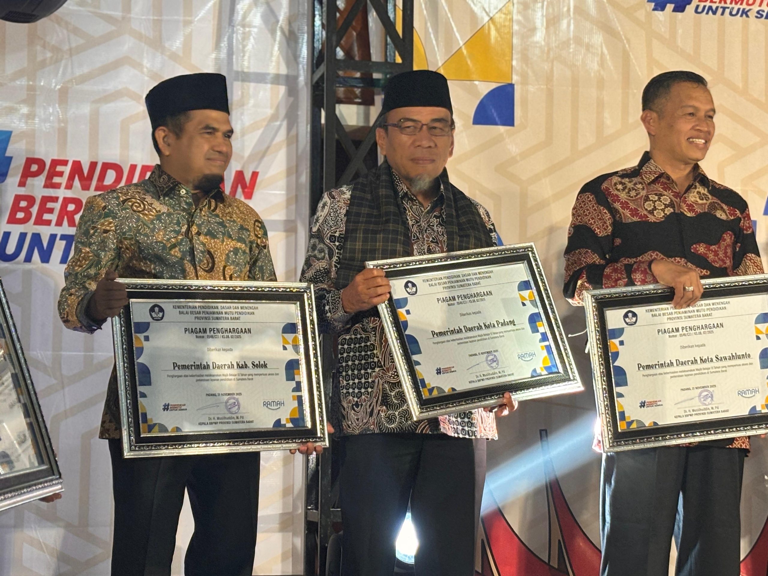 Padang (Wasiat24.com) – Dalam upaya memperkuat kolaborasi dan menyinergikan langkah antara pemerintah pusat dan daerah dalam memajukan dunia pendidikan, Balai Besar Penjaminan Mutu Pendidikan (BBPMP) Provinsi Sumatera Barat menggelar “Apresiasi Pemerintah Daerah Terbaik dalam Dukungan Program Prioritas Kemendikdasmen” di Aula Gedung Engku Syafei Padang, Jumat (21/11/2025).