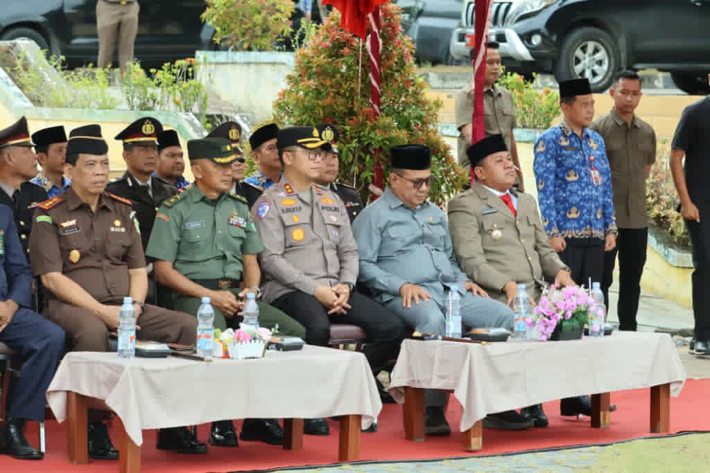 Upacara yang dimulai pukul 08.00 WIB ini dipimpin langsung oleh Bupati Kuansing Dr. H. Suhardiman Amby, M.M. Kegiatan tersebut turut dihadiri oleh jajaran Forkopimda, di antaranya Kapolres Kuansing AKBP R. Ricky Pratidiningrat, S.I.K., M.H., Pabung Mayor Inf. Legimin mewakili Dandim 0302/Inhu, Kajari Kuansing Muhammad Harun Sunadi, S.E., S.H., M.H., Ketua DPRD Kuansing Juprizal, S.E., M.Si., serta unsur pengadilan, Kemenag, pejabat Pemkab Kuansing, personel Polres Kuansing, dan ASN di lingkungan Pemerintah Kabupaten Kuansing.