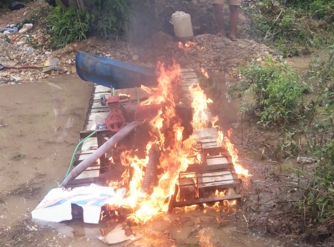 “Terhadap tiga unit rakit PETI yang ditemukan di lokasi, langsung kami lakukan penindakan dengan cara dibakar agar tidak dapat digunakan kembali,” ujar IPDA M. Ali Sodiq.