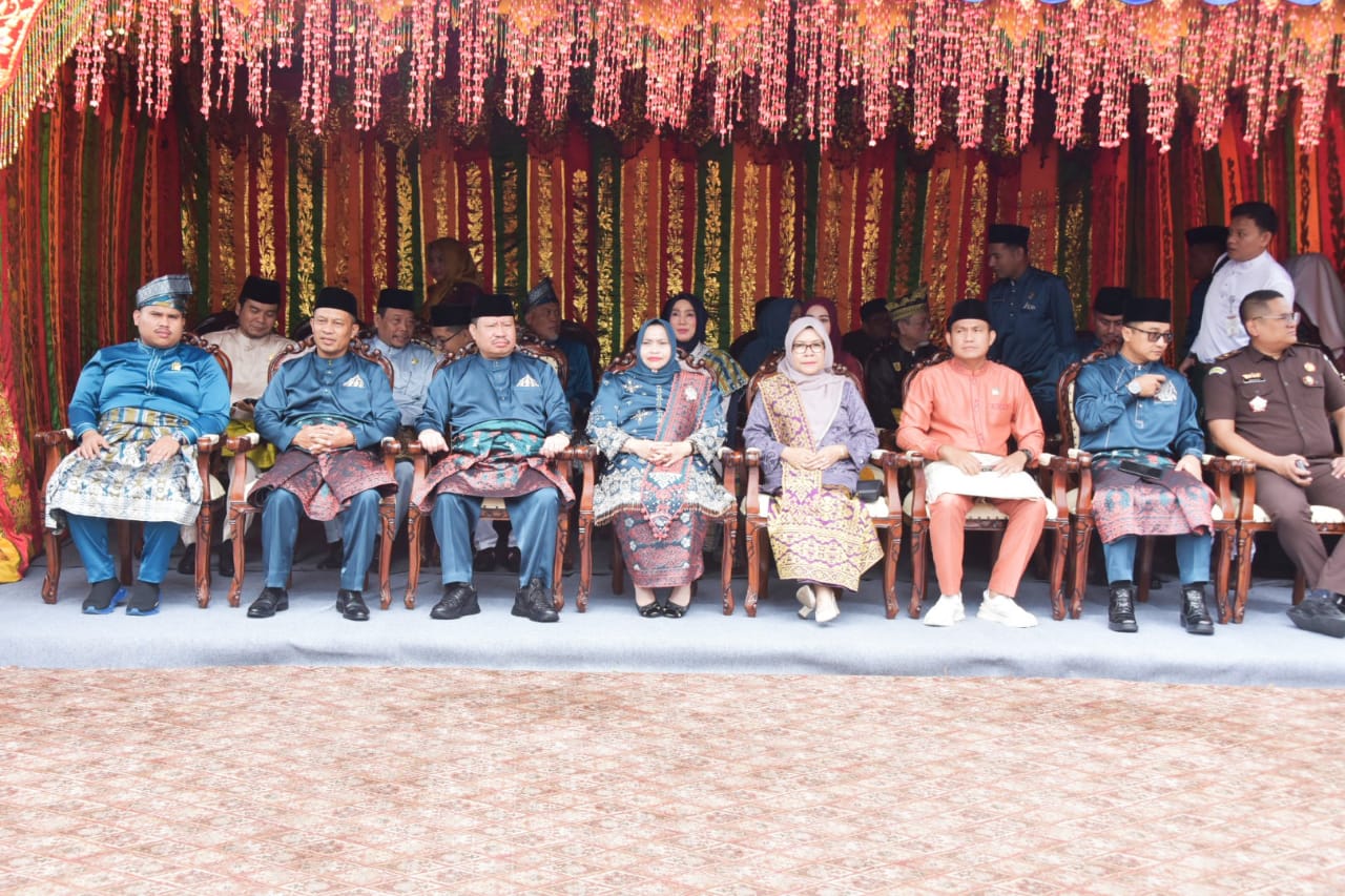 Usai melewati jajaran bunga manggar, rombongan Bupati Kasmarni yang didampingi Wakil Bupati dan Bupati ke-14 Bengkalis Amril Mukminin dan unsur Forkopimda Kabupaten Bengkalis dan diapit oleh bujang dan dara