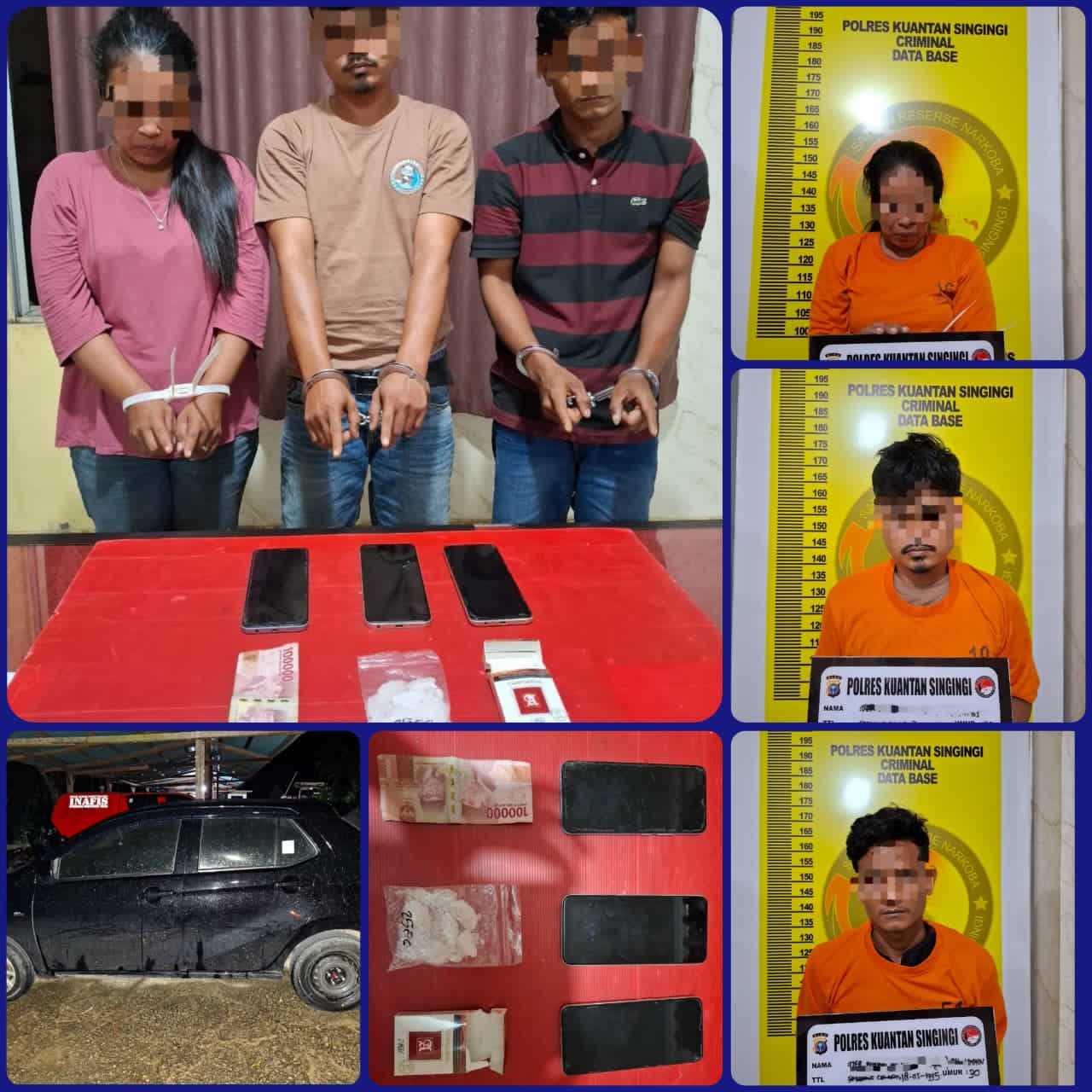 Ketiga pelaku yang diamankan yakni berinisial D(33), seorang wiraswasta asal Desa Pisang Berebus, Kecamatan Gunung Toar, inisial IB(30), pelajar/mahasiswa asal Seberang Cengar, Kecamatan Kuantan Mudik, dan LS(34), ibu rumah tangga warga Bukit Pedusunan, Kecamatan Kuantan Mudik. Ketiganya diduga berperan sebagai pengedar narkoba.